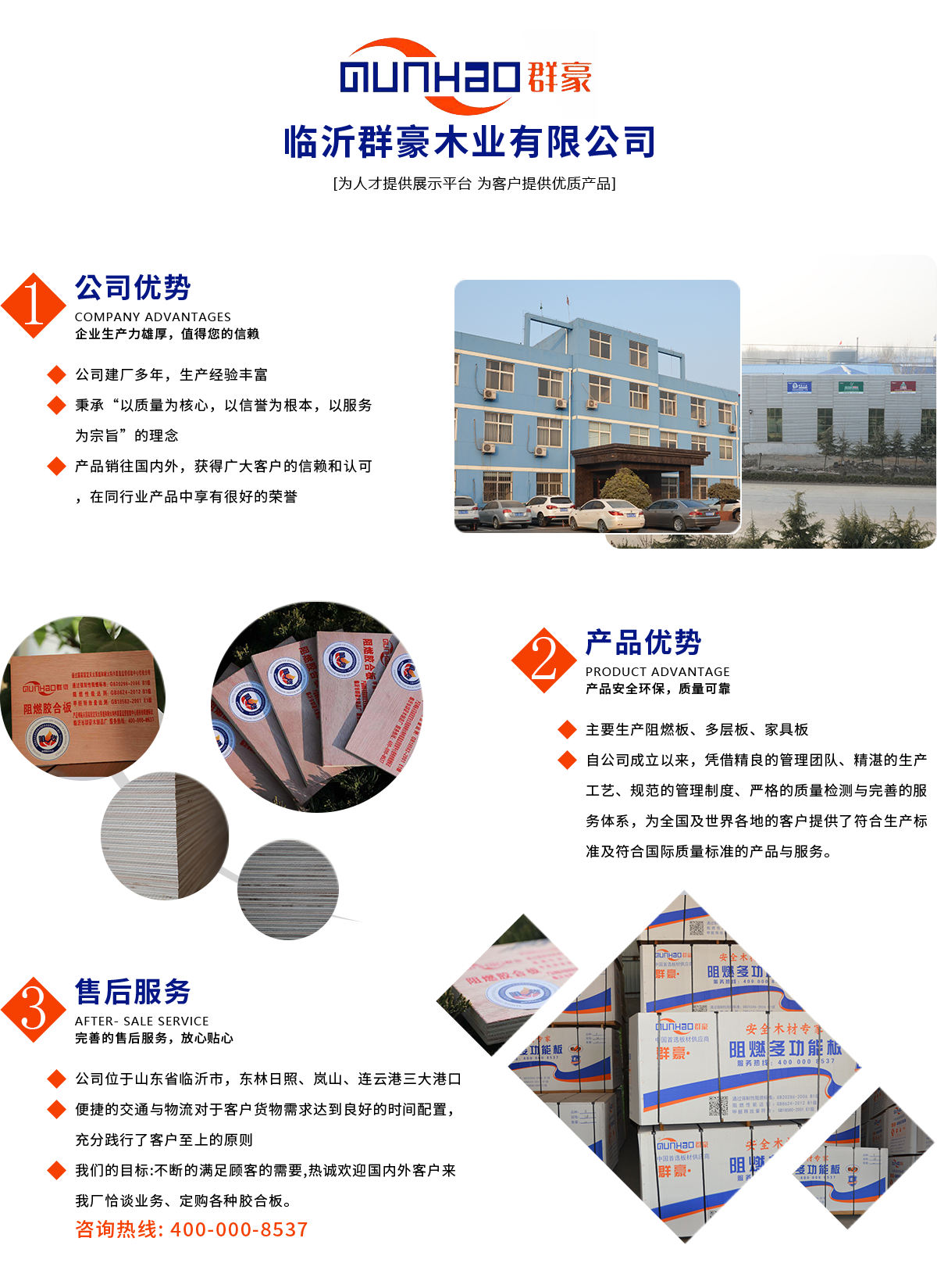 臨沂群豪木業(yè)有限公司創(chuàng)建于2010年,工廠(chǎng)位于交通便捷的朱保北工業(yè)園,主要生產(chǎn)膠合板、阻燃板、家具板、包裝板,占地面積約12萬(wàn)平方米,擁有12條高質(zhì)量材生產(chǎn)線(xiàn),員工600余人,年產(chǎn)量達(dá)10萬(wàn)多立方米。創(chuàng)建六年多來(lái),憑借豐富的經(jīng)驗(yàn),精良的膠合板生產(chǎn)設(shè)備,的生產(chǎn)工藝,規(guī)范的管理制度,嚴(yán)格的質(zhì)量檢測(cè)和完善的服務(wù)體系,為國(guó)內(nèi)及世界各地的客戶(hù)提供符合相關(guān)生產(chǎn)標(biāo)準(zhǔn)及質(zhì)量標(biāo)準(zhǔn)的產(chǎn)品和服務(wù)。